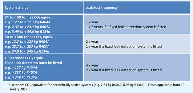 Equipment with between 50 and 500 tonnes CO2-eq of refrigerant may have the frequency of leak checks changed from January 1 2015 (for instance, 20kg of R404A in a system without leak detection system currently has to be checked every 12 months; under the new system, it must be leak checked every 6 months).