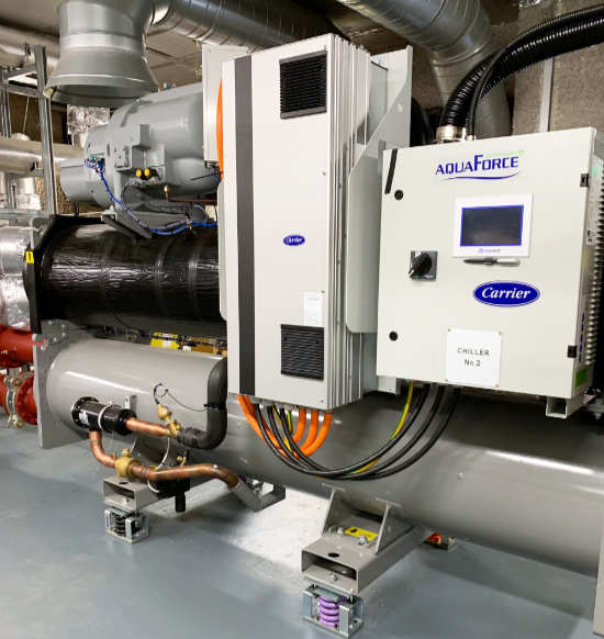 The two Carrier high performance AquaForce 30XW-V variable speed R134a chillers selected employ inverter-driven twin-rotor screw compressors. These enable the chiller to achieve ESEERs of up to 8.