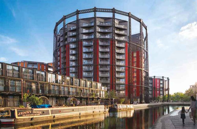 In converting the 4.5-acre brownfield site, the London-based developer, St William, is retaining the two historic Victorian gas holder frames to frame 555 new homes, including 146 affordable properties, along with more than 4,180m2 of community and commercial facilities, including cafés, gyms and shops.
