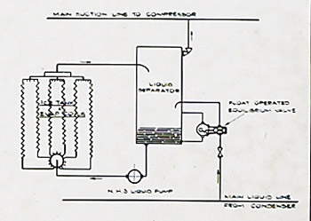 The liquid ammonia, instead of being fed directly to the evaporator coils was led into the liquid separating vessel. A motor-driven ammonia liquid pump circulated the ammonia through the evaporator coils, from which it was returned to the liquid separator. The liquid fell to the bottom of the vessel to be re-circulated by the pump and the dry gas was drawn off from the upper part of the vessel through the suction main by the compressors.