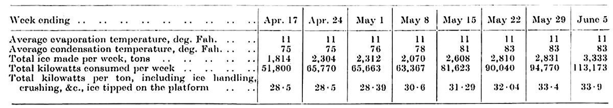 These figures were taken when the rate of ice lifting was constant and are claimed give the true performance of the plant. The table below taken from the company’s logs and included in the published booklet 1,100 tons Ice Plant provides a record of working over an eight week period. However, owing to the electrical installation not being complete, the authors comment that was only possible to give the total kW consumption and not split the figure up, as is the case with the test results when specially calibrated integrating wattmeters were fitted in the circuit of every electric motor in operation.