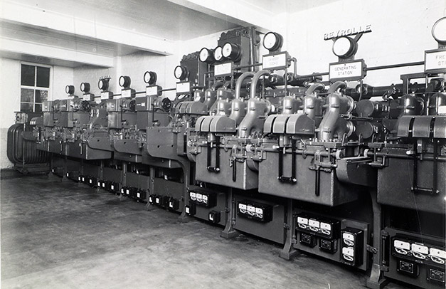 Above, right: Two Sulzer multi-stage pumps driven by 32hp motors at the floor level were employed to deliver water from the 175ft deep boreholes into a tank on the roof.