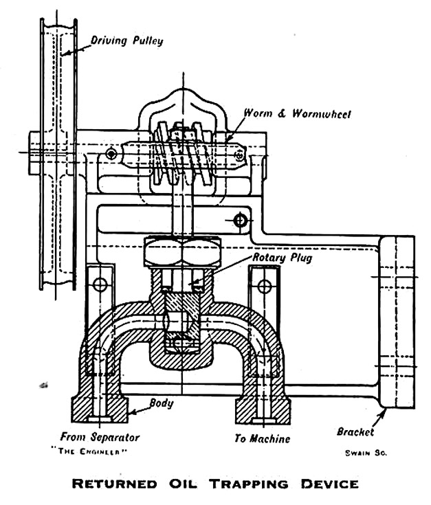 The oil trap was described as a plug cock with a blind port, arranged in the return oil circuit and driven quite slowly by a worm gear (see drawing right). When the port faced the inlet for the return oil it was free to take a charge of oil, which at the next half revolution was passed to the crankcase; but there was never any through connection between the two sides of the plug cock.