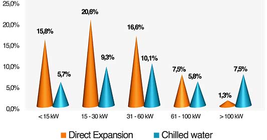 Two-thirds of the units sold in the EMEA region are direct expansion units and the remaining third are chillers. Amongst the chillers, the medium-capacity machines (between 15 and 60kW) represent half of all sales. The distribution is reported to be more even for direct expansion machines as sales include almost as many small-capacity (under 15kW) as medium-capacity machines.