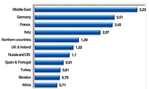 Of the approximately 30,000 units sold in EMEA in 2013, over 25,000 units were sold in Europe. The market leader remains Germany with 12.5% of the market share followed very closely behind by the UK with 11%. Russia and its ex-satellites continue to hold third place on the market with 10.5%, with 3,200 units sold. The Middle East and Africa have respective shares of 9.5% and 6.5%.