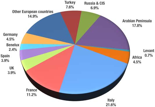 Despite a contraction of about 10% compared to 2012, Italy is still the major market with 25% of all sales, followed by France with a 14% market share. Sales in Germany and the UK remained modest, each with a market share of approximately 5%. Spain and Portugal which recorded respective rises of 8% and 3%. However, the tides have turned for Poland and the Northern countries, which have dropped by 10% and Russia which experienced a sharp 4% decline after two years of growth.