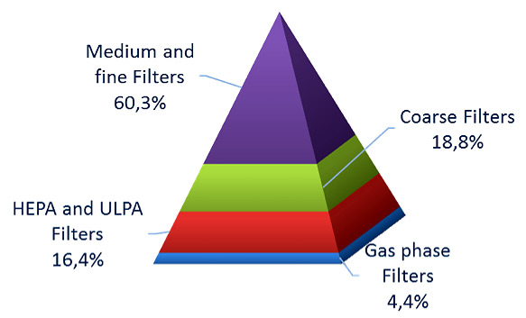 The market share of fine and medium filters has continued to increase these last few years, achieving 60% of the market in 2013. Next in line are the coarse filters with 19%, and then the HEPA-ULPA filters with 16%. Gas-phase filters barely represent 5% of sales.