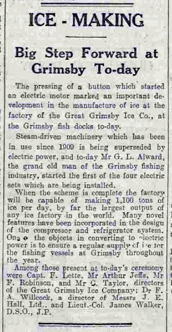 On Wednesday, December 16, 1931, the Grimsby Daily Telegraph ran the headline Mammoth Ice Factory Inaugurated, noting that the modernised factory “will be capable of producing 1,100tons of ice per day – by far the largest output of any ice factory in the world.”