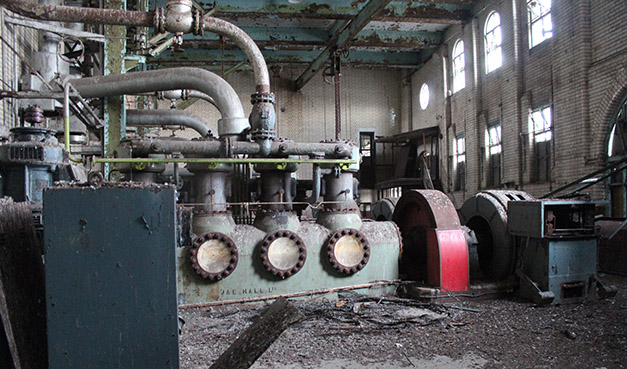 The most significant pieces of equipment are four huge 80-year-old J&E Hall ammonia compressors, and another of a similar size installed in the 1950s. They cannot be removed without demolishing the building, and have stood silent like sentinels, waiting on others to decide their fate ever since the factory finally closed its doors in 1990.