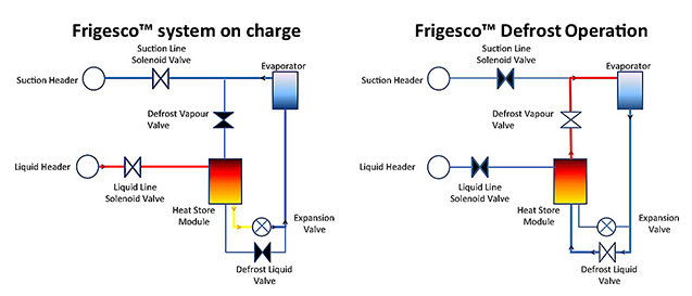 “It uses a specialist food-safe, phase-change material to store heat energy generated by the refrigeration system in the course of normal operation,” says David Walter. “It then uses the latent heat energy stored in the phase-change material to defrost evaporators, as and when required.”