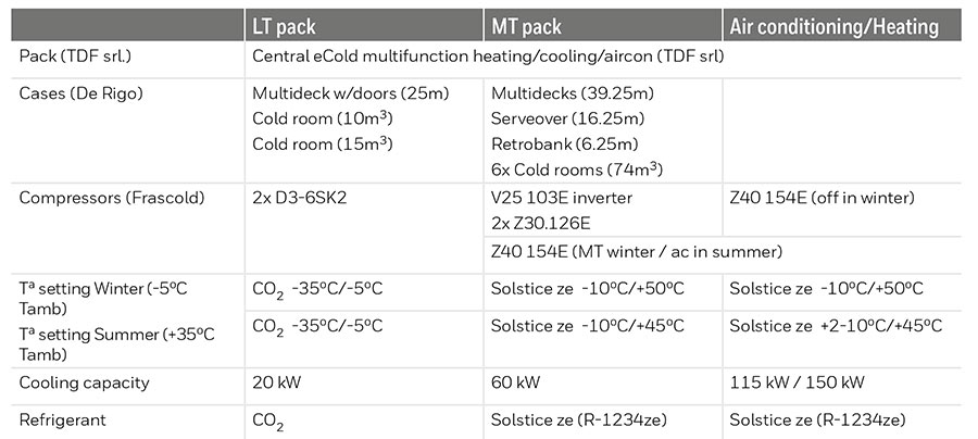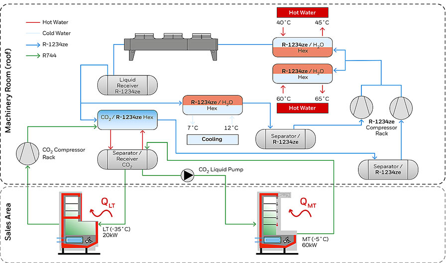 A charge of 150kg of Honeywell’s R1234ze brand refrigerant Solstice ze is used as the primary refrigerant for cooling a pumped CO2 MT system, with 400kg of CO2 then cascaded to the LT system to deliver the required performance.