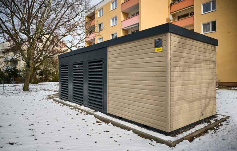 The Energy Unit can also be equipped with sound-absorbing weather protection grilles, allowing for significantly reduced distances to residential buildings. A modern wooden facade and steel elements, as well as an optional green roof, enable discreet integration into the surrounding neighborhoods.
