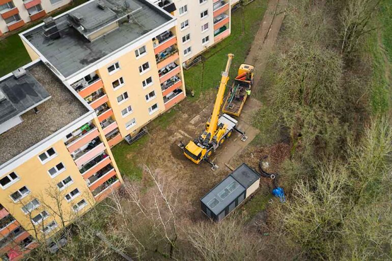 The two apartment buildings, constructed in 1967, each comprise ten residential units with approximately 720m2 of living space per building. Previously, heating was provided by a gas-fired central heating system. Following the failure of one of the heat generators and due to the limited space in the utility room, the owners opted for the Energy Unit 2.0. This modular prefabricated six-stage heat pump cascade system, achieving a total output of approximately 80kW, was delivered ready for connection, and installed outdoors.