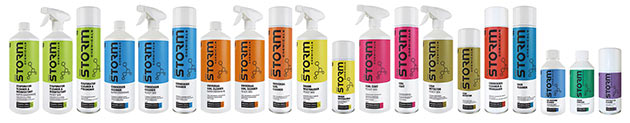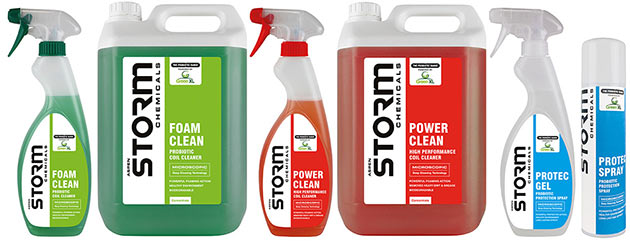 The Storm range comprises: an evaporator cleaner and disinfectant, condenser cleaner, a universal coil cleaner, odour neutraliser, condenser cleaner and degreaser, case cleaner, an ice machine cleaner and drain cleaner. Also included is a specially designed cleaner for portable air conditioners, a leak detector spray, and a spray-on coil protector.
