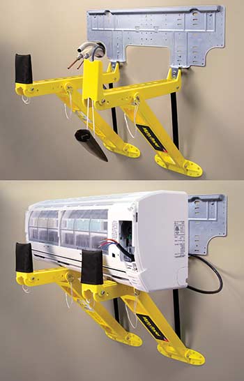 Manufactured by Houston-based RectorSeal, the Mighty Bracket hooks onto both tabs of a mini-split wall mounting plate in less than a minute. It securely holds the mini-split evaporator coil for quick and easy connections of electrical, refrigeration line sets and condensate drain pumps/hoses.