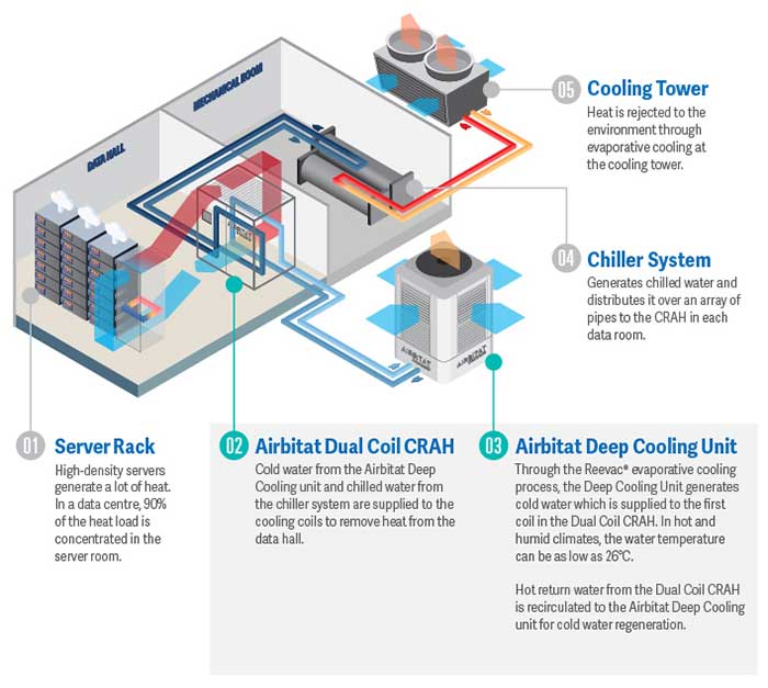 Backed by extensive R&D, the Airbitat DC Cooling System comprises a dual coil computer room air handler (CRAH) and a Deep Cooling Unit that’s powered by ST’s patented Reevac Deep Cooling technology. The Airbitat DC Cooling System works by pre-cooling the hot return air in the data hall to reduce over 40% of the heat load from the existing chiller system.