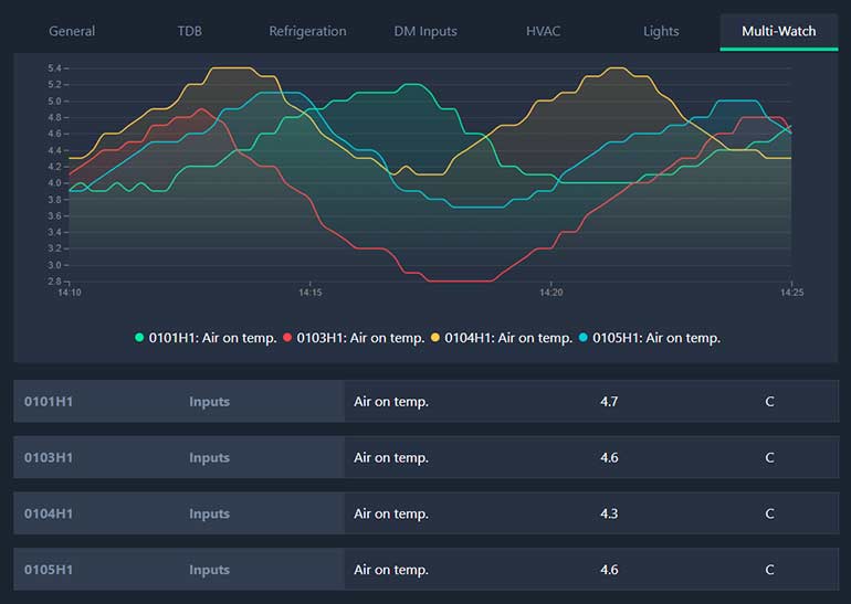 For HVAC/BMS or refrigeration applications, the system has the capability to create a panel-specific dashboard. Options include gauges, real-time graphs, alarms, device status, temperature performance indicator and discipline summaries.