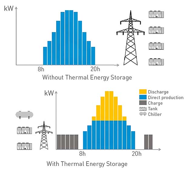 It also reduces the load on the chiller by smoothing-out peaks in the daily load profile, in the process also reducing chiller maintenance costs and the size of the combined refrigerant charge on a site.