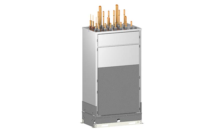An overall system can be expanded using additional horizontal sub-HBC’s allowing up to 50 indoor units to be supplied by one outdoor condenser. The Vertical HBC includes intuitive load adjusting flow control valves and inverter driven pumps.