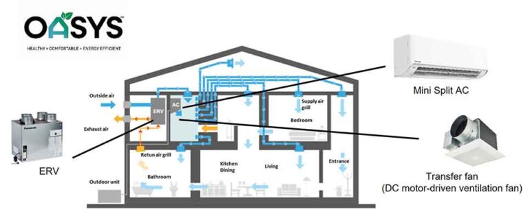 The OASYS Residential Central Air Conditioning System employs a mini split heat pump air conditioner, energy recovery ventilator and DC motor-driven transfer fans.