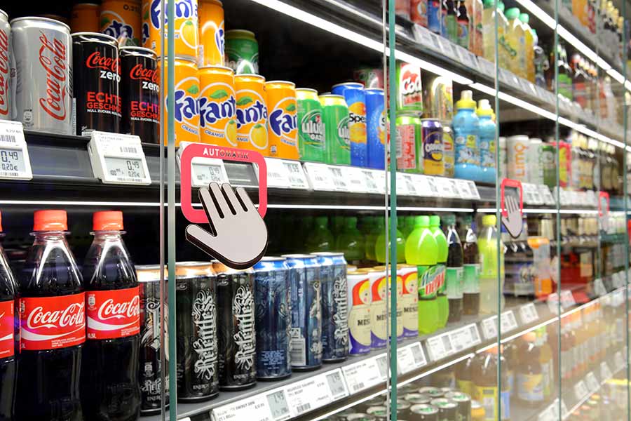 The glass doors automatically open when a shopper wants to take refrigerated food from the display case. The effect is achieved with an integrated sensor, which reacts to any movement within a defined radius of action. The active area and sensitivity is adjustable.