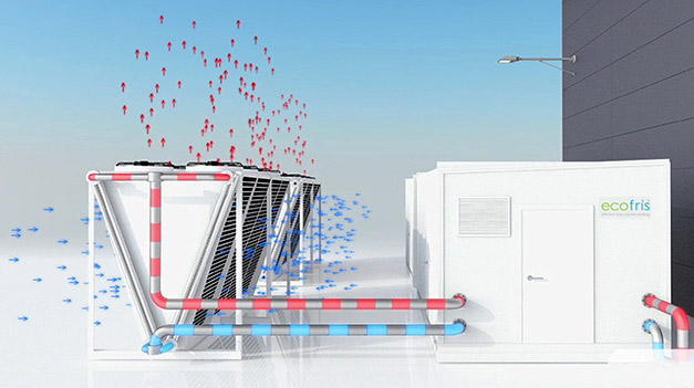 Employing a water cooled chiller for high ambient and a dry cooler with adiabatic for free cooling, the Ecofris system combines through wall airflow and ceiling return with integrated pressure and temperature controls.