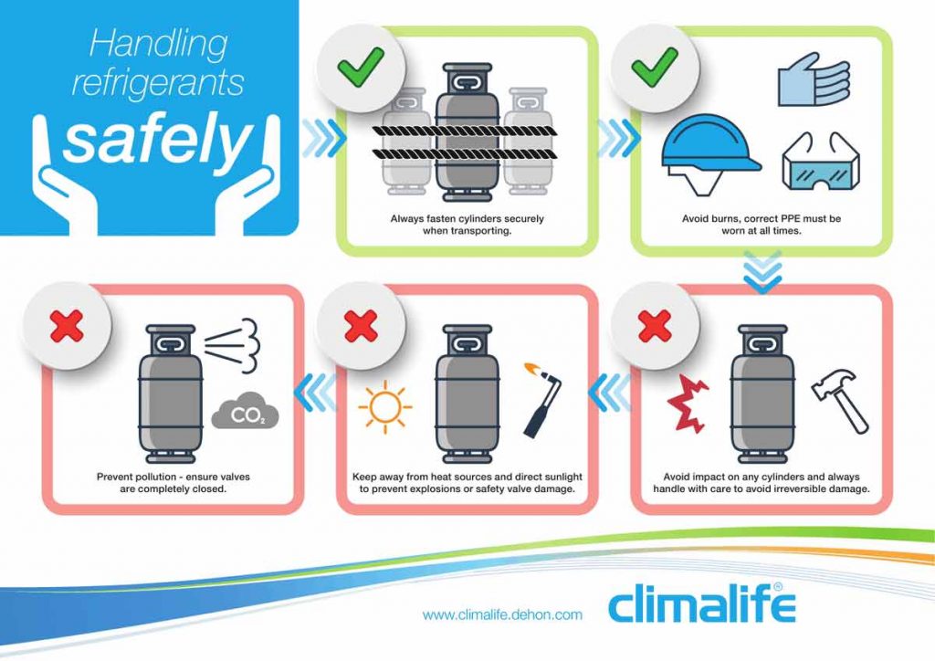 The infographic style guide is described as a handy reference tool for industry professionals to review and display, with useful reminders on safety measures to take. It also features an added reminder of Climalife’s application-based tools that can help engineers when managing refrigeration installations.