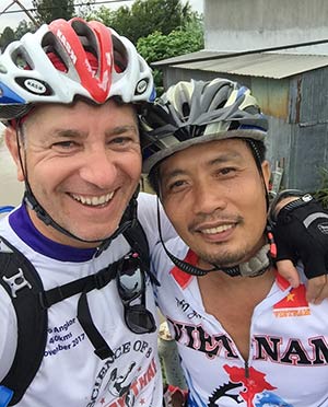 Accompanied by a local guide and a support vehicle for their bags, the party of 16 men and one woman cycled around paddy fields and along twisty temple-lined tracks in the lush Mekong Delta in Vietnam and then through the dry lands of ancient Cambodia.