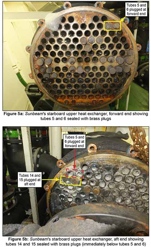 It was also found that 17 tubes in the port upper heat exchanger had been blocked at each end with brass plugs. The starboard upper heat exchanger had 27 tubes plugged. Of these 27 plugged tubes, 23 had a plug in each end, while four of the tubes had a plug fitted at only one end. Pressure testing identified leaks on four of the tubes in the starboard evaporator, one of which, had only been plugged at one end.