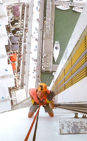 With so many rooftop air conditioning plant rooms, a head for heights would have been a distinct advantage for Andy in tackling the 100m drop – a distance that’s twice the height of Nelson’s Column.