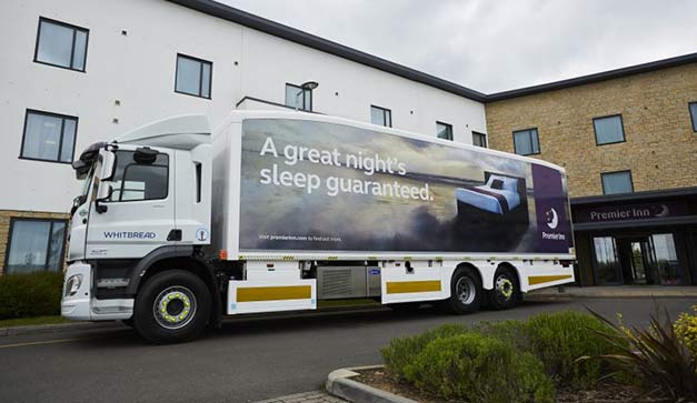 Both vehicles are in daily operation in a busy urban environment, transporting a mix of ambient, chilled, and frozen produce to the Whitbread-owned Premier Inn chain.