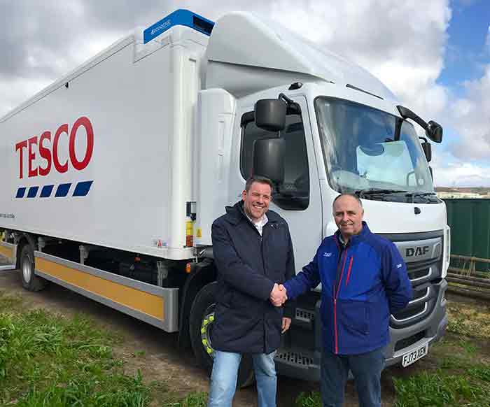 The supermarket giant has taken delivery of two 18-ton trucks with refrigerated bodies and the purely electrically powered Ecooltec transport refrigeration system. These are now running between the Tesco warehouse in Peterborough and the surrounding Tesco branches.
