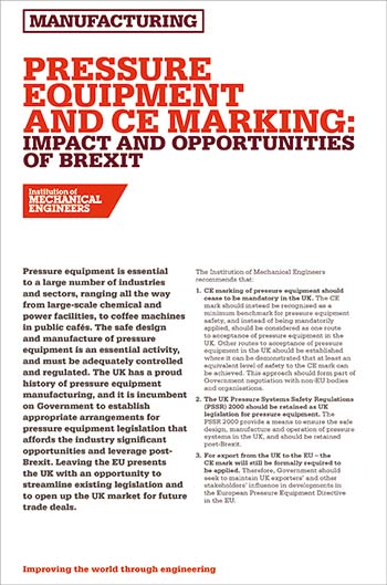 The IMechE supports UK government proposing a UK mark and new regulations to maintain safety standards, insisting that provided the UK establishes appropriate safety rules, Brexit may provide new opportunities for UK pressure equipment manufacturers.