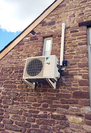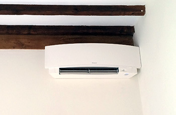 The installation of a Daikin R32 wall-mounted Emura split system was carried out on a first floor bedroom in a residential barn conversion near Malvern.