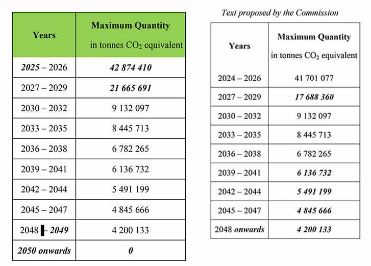 The new document introduces a slightly more relaxed phase down in the early years than the original European Commission proposals, which sought a near 50% phased down from current quota levels next year to 41.7MtCO2e. The new proposals provide for a slightly higher allowance of 42.9MtCO2e.