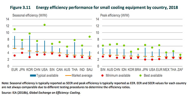 Global best available air conditioning equipment is said to be up to five times more energy efficient than the least efficient equipment currently available, based on the seasonal energy efficiency ratio (SEER), which reflects the average annual energy efficiency of cooling equipment. It is twice as efficient as the market average based on the energy efficiency ratio (EER), which, the IEA says, better reflects the operational efficiencies of air conditioners during peak demand. The EWS maintains that a strong MEPS policy would be adjusted over time, for both EER and SEER metrics, to narrow these gaps between minimum available and best available technology.