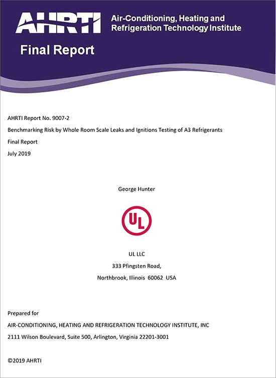 The Air Conditioning, Heating and Refrigeration Technology Institute (AHRTI), the AHRI’s research arm, conducted leak and ignition testing under whole room scale conditions to develop data and insight into the risks associated with the use of A3 refrigerants. The results will be used to support revisions of safety standards IEC/UL 60335-2-40 and IEC/UL 60335-2-89.