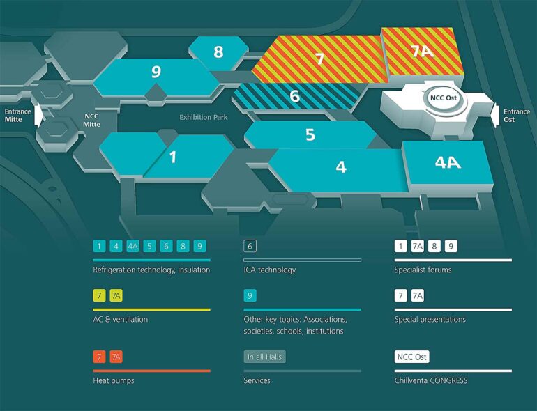 The main refrigeration product categories in Halls 8 and 9 will remain as in 2024. In 2026, AC, ventilation and heat pump technology will be exhibited in Halls 7 and 7A, which Nurnbergmesse says offers greater display area and more options for companies in these product categories. The refrigeration technology from Hall 7A will mostly be showcased in Hall 4A, while the refrigeration technology from Hall 7 will be accommodated in Halls 1 and 4. The main product categories in Halls 5 and 6 will be swapped over, with C&I technology housed in Hall 6.