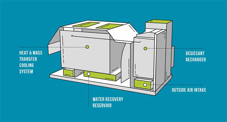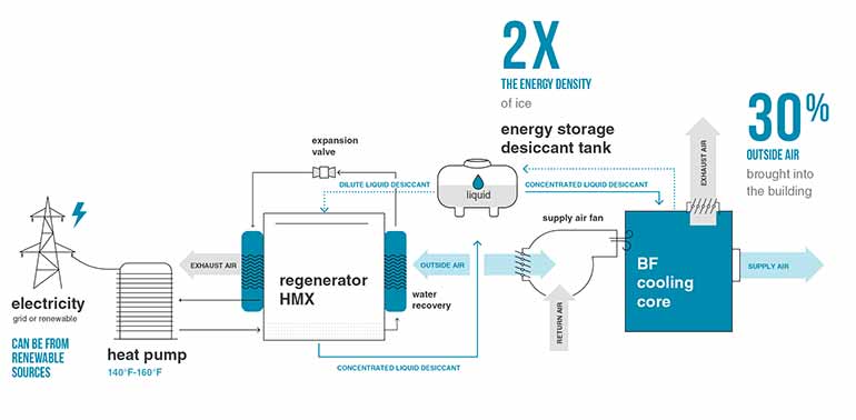 Blue Frontier’s AC system combines dew-point-style sensible cooling with liquid desiccant dehumidification. The desiccant is recharged and stored when electricity is the cleanest or lowest cost, and later used to deliver cooling when electricity is dirty or costly.
