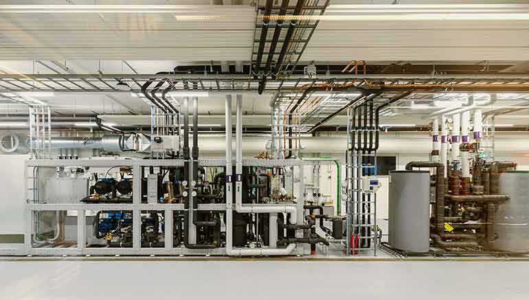 A heat recovery unit captures excess heat from the CO2 cooling systems to provide space heating for the entire store, as well as the surrounding community through the local Nordals Fjernvarmeværk district heating network.