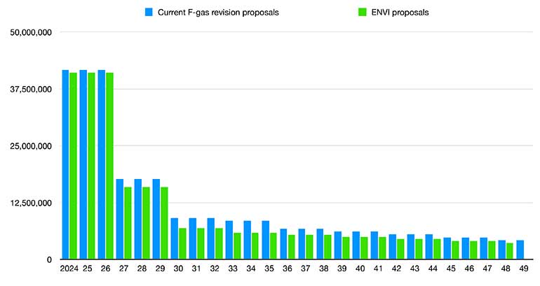 A stricter phase down is also proposed against the F-gas revision document, a phase down which has already been described by industry as unrealistic. Eickhout’s reduced phase down suggestion tracks the revision proposal timetable but, while the revision proposals allow 4,200,133 tonnes of CO2 equivalent from 2048 onwards, Eickhout seeks a ban on all F-gases in 2049.