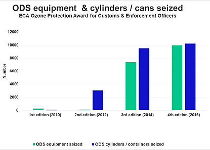 During the period from May 2014 to April 2016, the award winners reported 258 successful seizures of 9,947 pieces of equipment and 10,201 refrigerant cylinders/cans containing more than 70 tonnes of ozone-depleting substances.