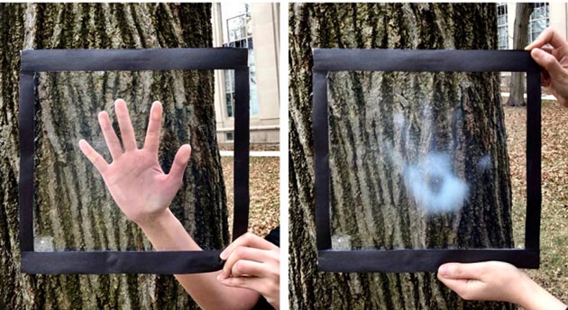 The film is similar to transparent plastic wrap. Its heat-rejecting properties come from tiny microparticles embedded within it. These microparticles are said to be made from a type of phase-changing material that shrinks when exposed to temperatures of 30ºC or higher. In their more compact configurations, the microparticles give the normally transparent film a more translucent or frosted look.