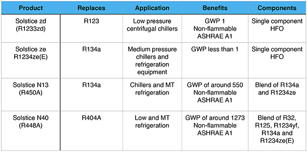 The new additions to Honeywell’s Solstice brand of HFO refrigerants are Solstice zd (R1233zd), Solstice ze (R1234ze), Solstice N13 (R450A) and Solstice N40 (R448A).