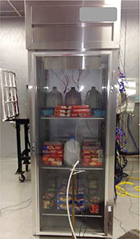 Tests were carried out on a 3/4hp R404A freezer with an internal volume of about 700 litres and rated capacity of around 560W. The top-mount self-contained refrigeration unit had a nominal charge of 354g of R404A and comprised a 1/2 hp hermetic compressor, air-to-refrigerant tube-in-fin condenser and evaporator, suction-line liquid-line heat exchanger and thermostatic expansion valve.