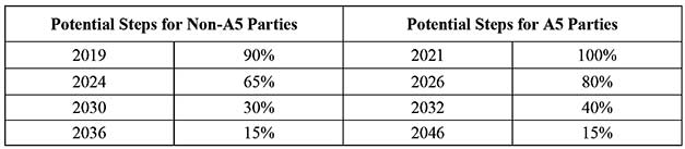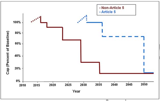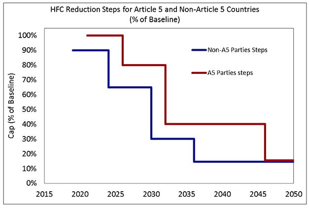 For Article 5 countries it proposes a 20% reduction in 2026 with an 85% phase-down by 2046. For non-Article 5 countries, it proposes a 10% phase-down in 2019, with an 85% phase-down by 2036.