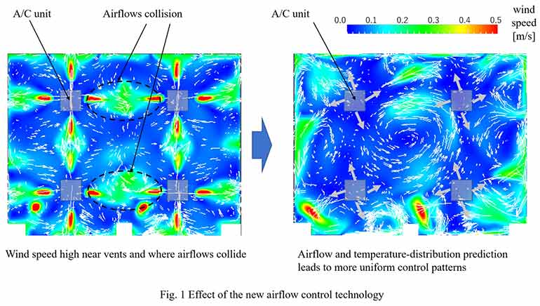 As a result, the technology enables airflow to be optimised, even when multiple AC units are operating in the same room. Airflow analysis enables the prediction of complex airflow and temperature distribution, which is used to determine ideal airflow volume and direction required to maximise room-wide comfort, including in spaces near the floor and behind obstacles. Collisions between diagonal airflows are avoided and conditioned air reaches all corners of the room relatively uniformly.