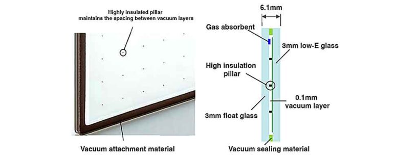 The door structure combines vacuum insulated glass with another sheet of glass. The VIG combines the insulating properties of a vacuum layer in a 6 mm thick unit. Together, the glass unit is said to be equal to or better than triple glazing and approximately 7.5 times than that of a single piece of glass. In addition, lead-free vacuum sealing material is used in the glass joints, so it is safe to use in food displays.
