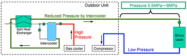 The product installed is Panasonic’s pressure adjust control type that first went on sale in Japan toward the end of last year. The solution addresses the common problem of variance in output pressure to the display case (usually 5-9MPa) by automatically controlling the transfer pressure from the condensing unit at about 6MPa, throughout the year.
