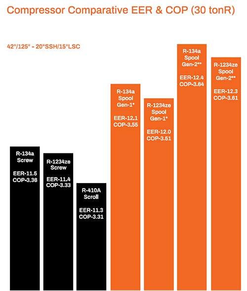 Tests on the latest generation of spool compressor being developed by Torad Engineering of Cumming, Georgia, are said to have recorded a system EER of 12.3 and COP of 3.61 when running on R1234ze. An EER of 12 is seen as an efficiency milestone necessary for cost effective adoption of low and ultra-low GWP HFO refrigerants in light commercial chiller and heat pump applications. This includes refrigerants such as R513A and HFO1234ze.
